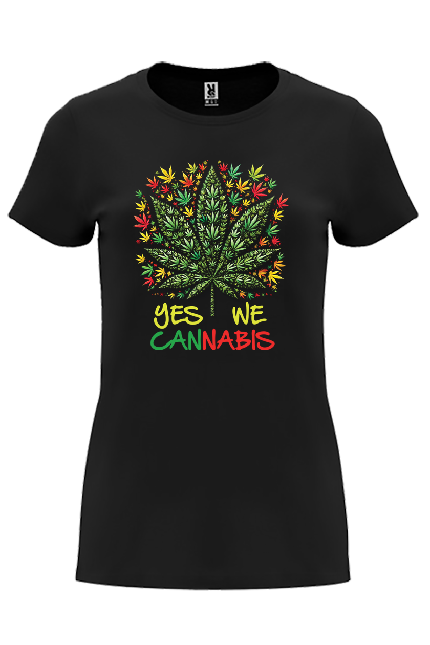 Expresa tu estilo con esta camiseta unisex  o femenina de diseño exclusivo. Presenta una gran hoja de marihuana formada por múltiples hojas más pequeñas en un vibrante collage de colores verde, amarillo y rojo, inspirado en la cultura rasta y el reggae. Acompañado del mensaje «YES WE CANNABIS», este diseño resalta perfectamente sobre la base negra de la camiseta, ideal para quienes aman la libertad, la naturaleza y la autoexpresión.