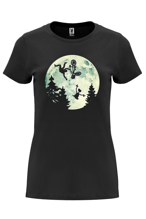 Un giro inesperado a una escena icónica. Esta camiseta negra unisex o femenina presenta una original parodia en la que la silueta de un ciclista y su compañero extraterrestre parecen perder el control bajo la luz de la luna. Un diseño divertido y nostálgico, ideal para amantes del cine y la cultura pop.