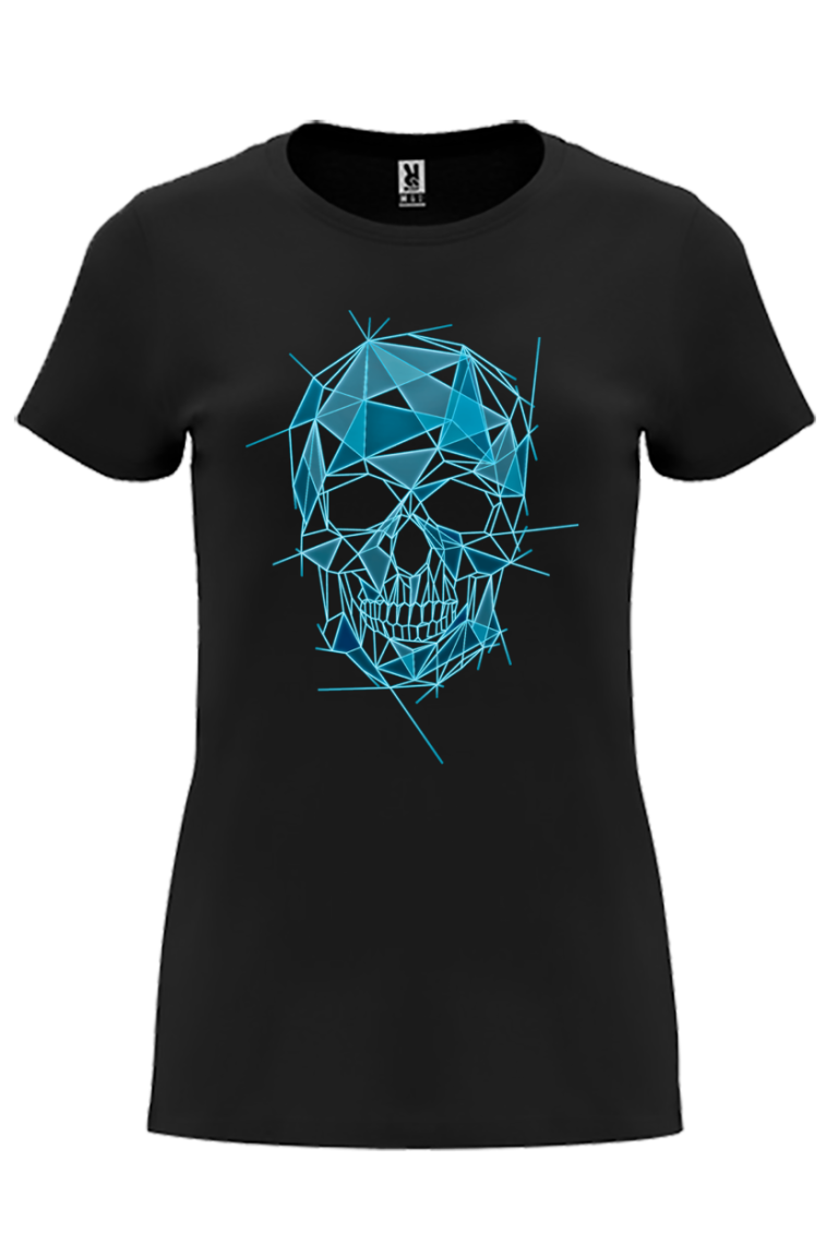 Esta camiseta negra unisex o femenina presenta un diseño moderno y vanguardista con una calavera de estilo geométrico en tonos azul neón. Inspirada en la estética cibernética y futurista, su impactante ilustración parece construida con haces de luz, aportando un aire tecnológico y audaz. Ideal para quienes buscan un look alternativo y llamativo, perfecta para combinar con outfits urbanos y destacar con un diseño innovador.
