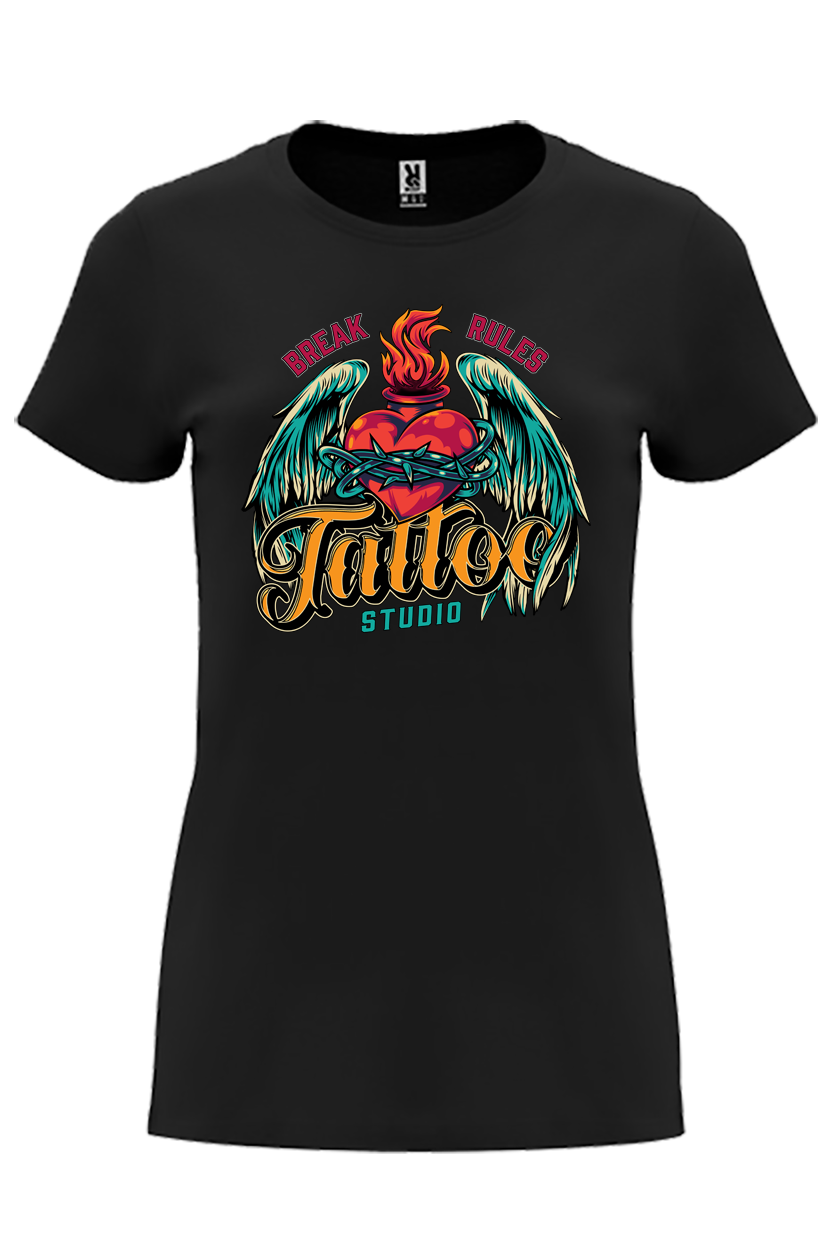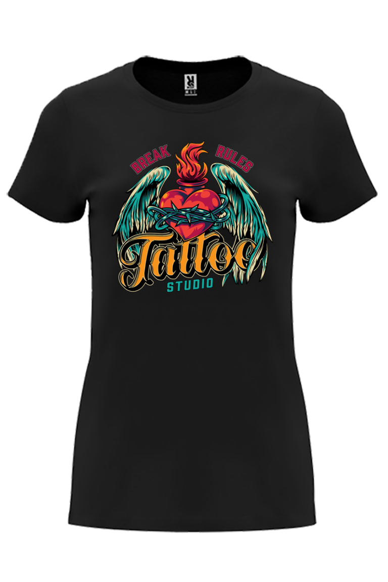 Dale un toque rebelde y auténtico a tu estilo con nuestra camiseta «Corazón Espinado». Su diseño inspirado en el arte del tatuaje combina un corazón ardiente rodeado de espinas con unas alas vibrantes, acompañado del mensaje «Break Rules».