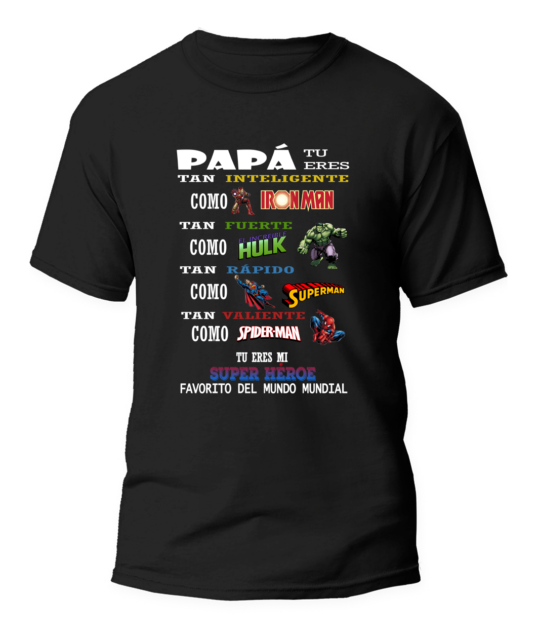 ¡Porque ningún héroe de cómic se compara contigo, papá! 💥 Esta camiseta es el regalo perfecto para el Día del Padre. Destaca la inteligencia de Iron Man, la fuerza de Hulk, la velocidad de Superman y el valor de Spider-Man… ¡Todo en uno! 🖤 Para ese superhéroe favorito del mundo mundial que siempre está ahí. 🌟